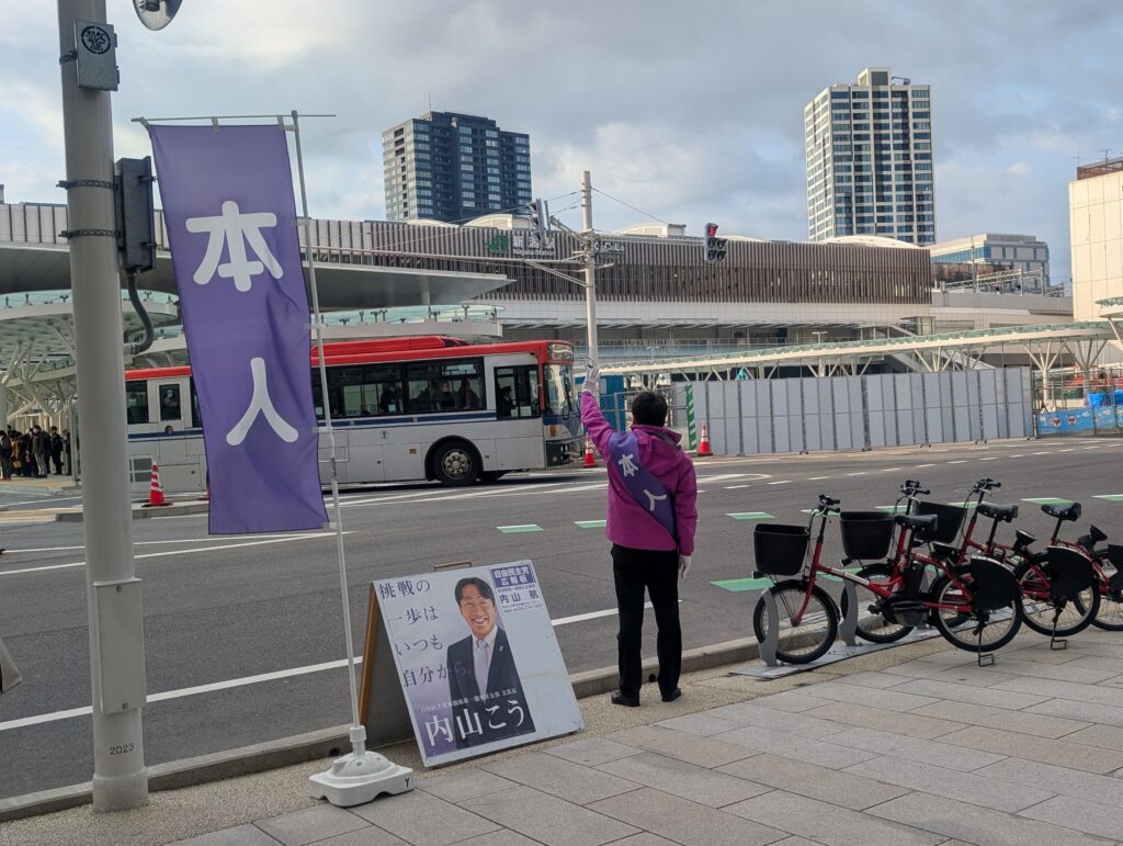 駅前で辻立ちをしてから日中はずっとあいさつ回り。
